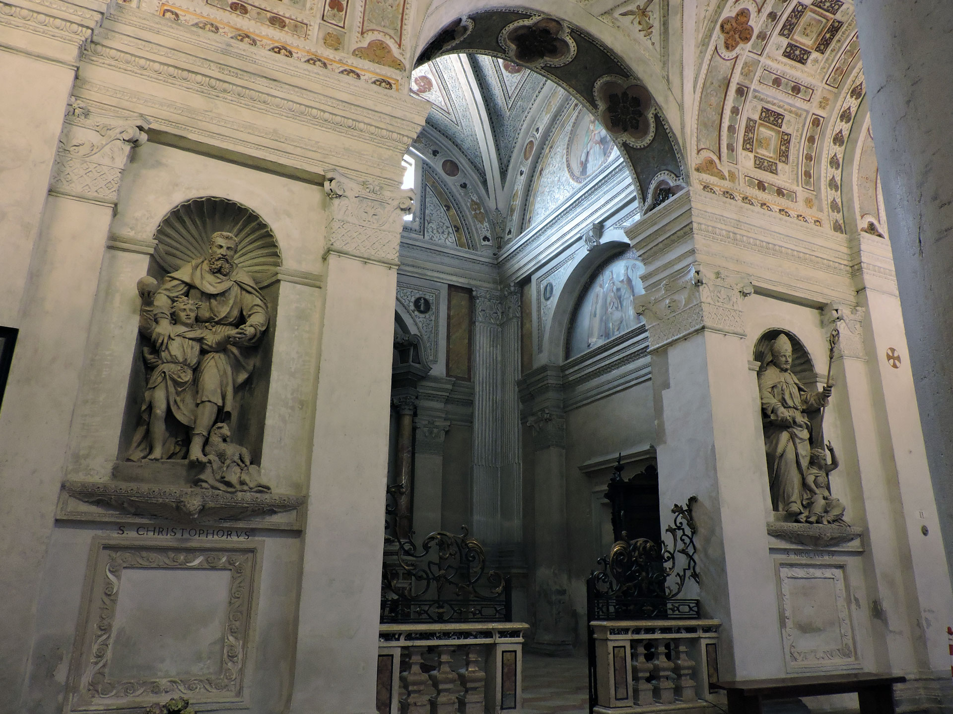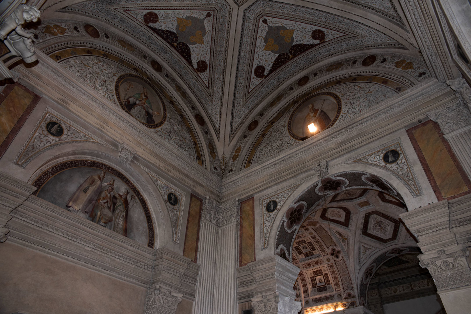 The church of San Benedetto al Po was part of a monastery belonging to the Benedictines of the Cassinese Congregation (a reformed wing of the Benedictine Order). By the 16th century, it was one of the largest and most important Benedictine monasteries in Europe, and attracted some of the greatest religious minds and artists of the period. In 1540-47, the church was substantially enlarged and given a Renaissance facelift by Giulio Romano, the innovative painter and architect, and Raphael’s prime pupil. It was during this time that the chapel of Saint Nicholas was built, one of a suite of new side chapels located on the south side of the church. The chapel was also decorated with frescoes depicting the life of Saint Nicholas, again designed by Giulio Romano and executed by his workshop. Then, some 20 years later, Paolo Veronese was commissioned by Don Andrea Asola, the abbot of San Benedetto al Po, to paint the altarpiece for the chapel.