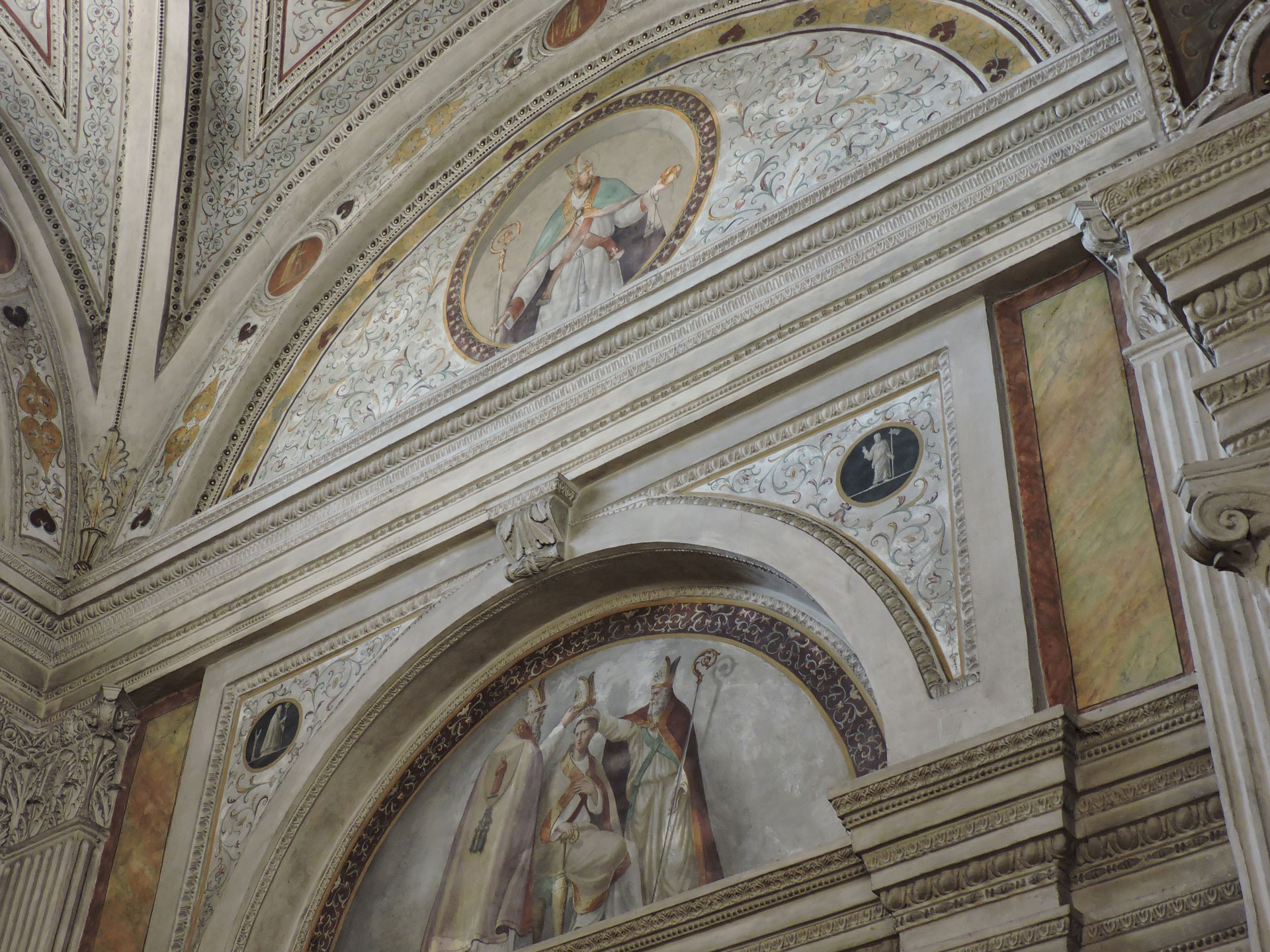The subject of the consecration of Saint Nicholas is rarely depicted in art. Indeed, we know of only two other independent images of this scene, produced before the end of the 16th century. More usually, we find an image of one of Saint Nicholas’ more popular miracles, such as his resurrection of three boys who had been killed by a butcher and cured in a barrel, ready to be sold off as ham. Also popular were images of the saint throwing three pouches of gold coins through the window of a poor man’s house – his famous act of gift giving that led to the association between Saint Nicholas and the figure of Father Christmas. What makes the choice of subject of the altarpiece even more surprising is that the scene already appeared among the frescoes on the chapel’s walls.