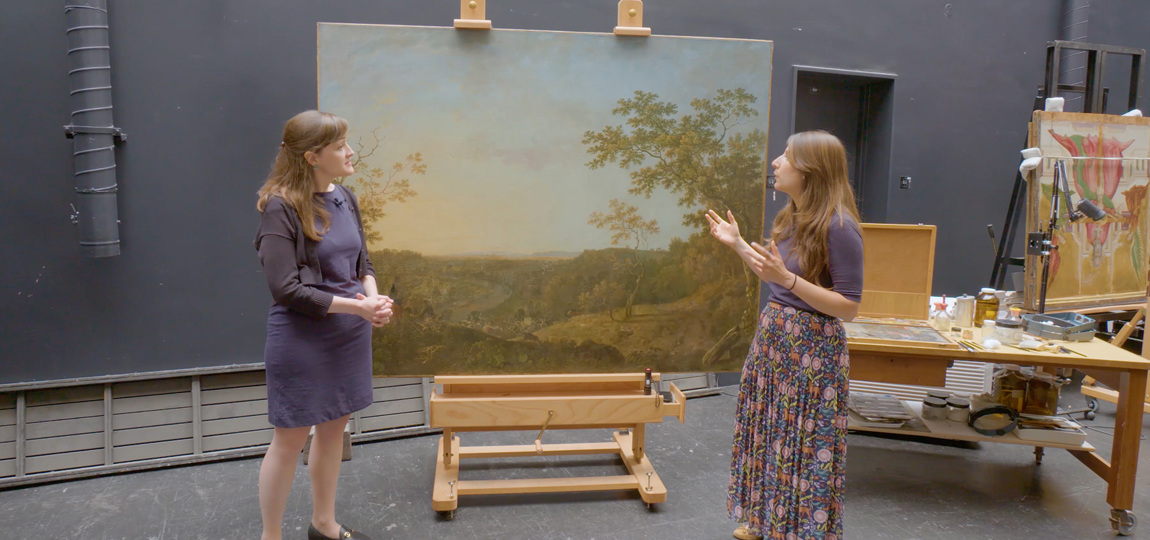 Curator Mary McMahon talks to Conservation Fellow Maria Carolina Peña-Mariño about the challenge of restoring Richard Wilson's painting The Valley of the Dee, with Chester in the Distance of about 1761.