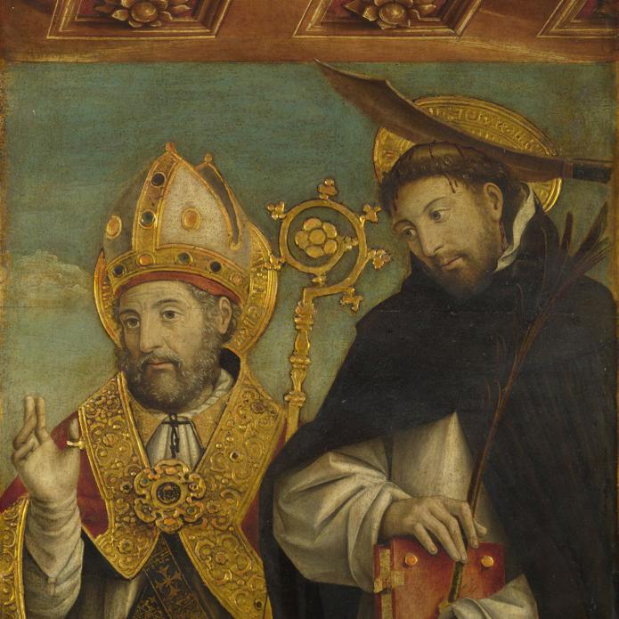 Saints Nicholas of Tolentino and John the Baptist and Saint Peter Martyr and a Bishop Saint, both in the National Gallery’s collection, are panels from the Dal Ponte Altarpiece. It was a multi-part altarpiece and we can tell that these panels would have formed part of the upper tier because the vaulted ceiling is painted as though viewed from below. The third panel of the upper tier is in a private collection.