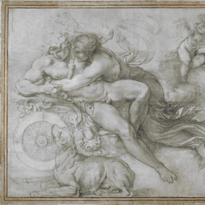 The ceiling shows stories taken from classical mythology based on Ovid’s Metamorphoses, and in particular the loves of the gods. However, we are not exactly sure of the subject of this cartoon and its fresco. The theme of the fresco facing it on the opposite side (the cartoon for which is also in the National Gallery’s collection) is unrequited love, but the woman in this drawing seems far from reluctant to be carried away.