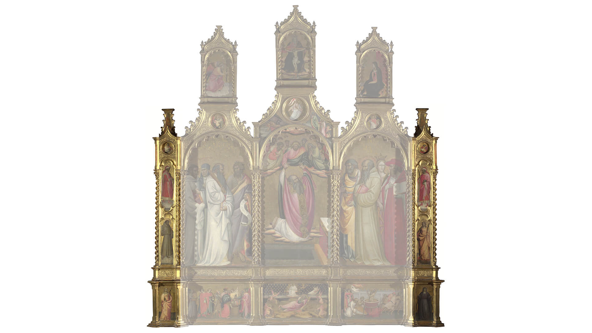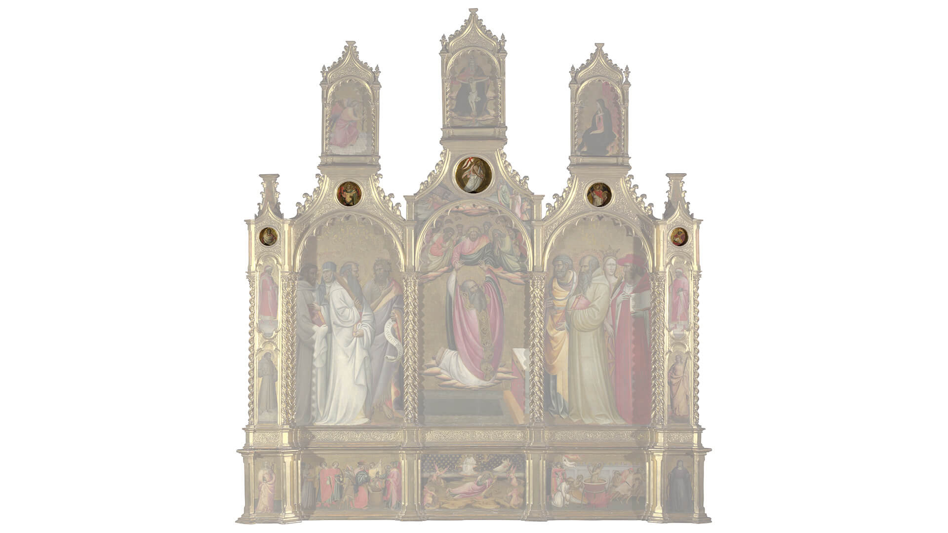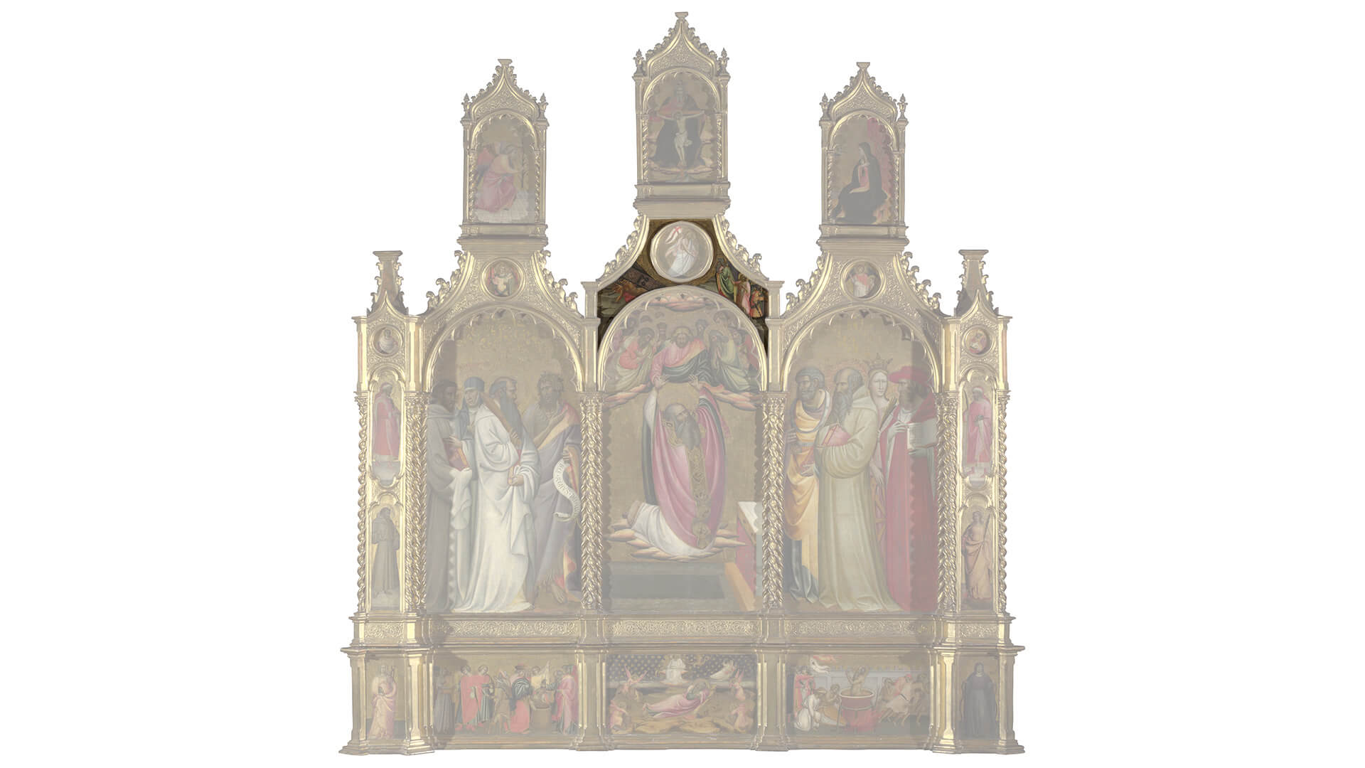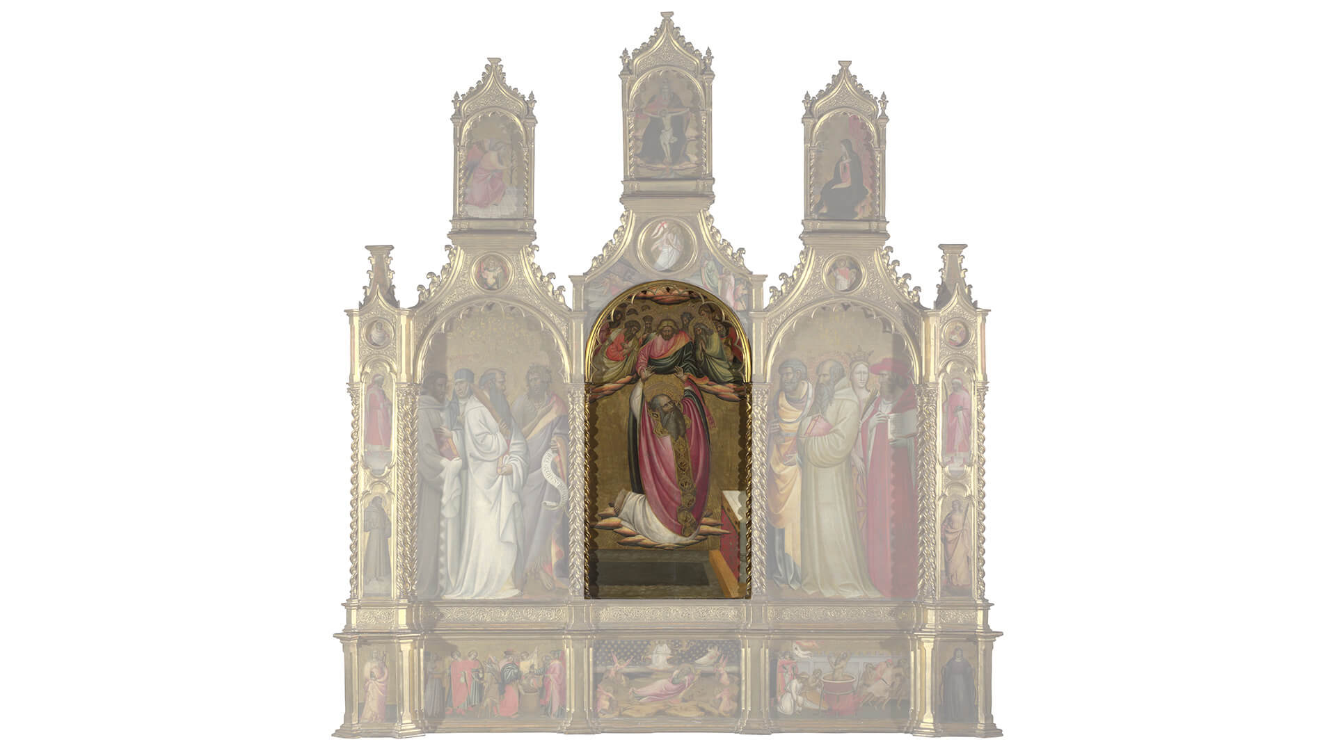 The central panel in the main tier usually represents the saint to whom the altar is dedicated. In altarpieces for high altars, this is often the saint to whom the whole church is dedicated, whereas in a side chapel it would be the dedicatee of that specific altar.