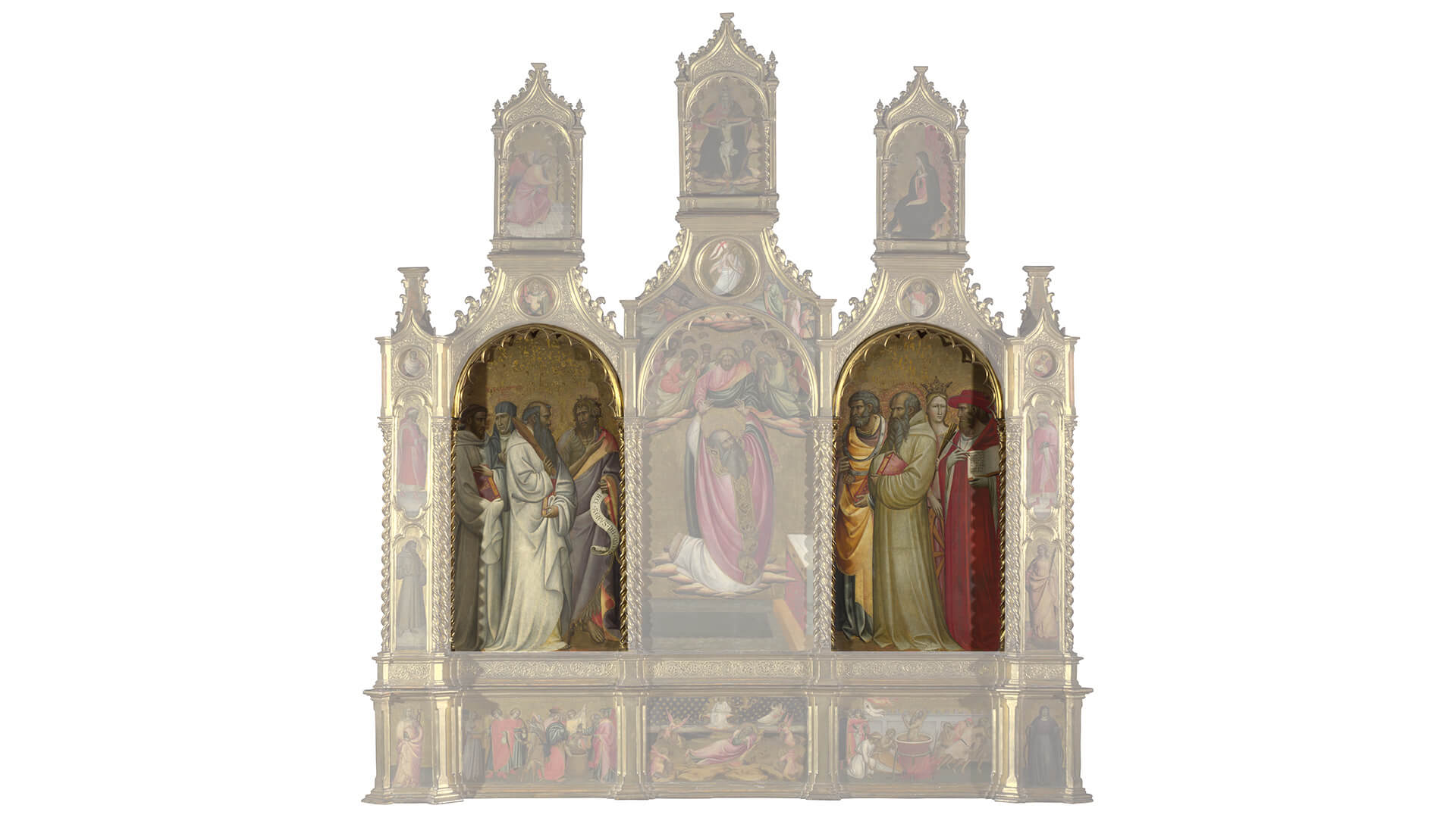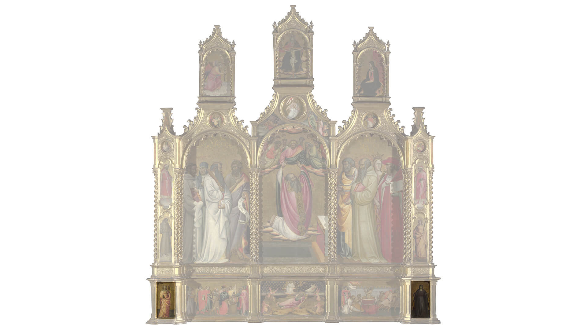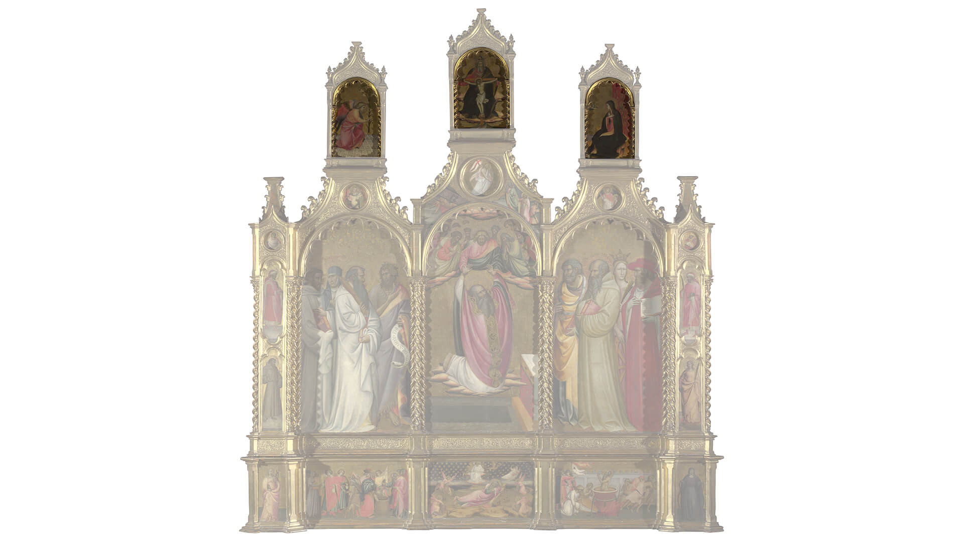Pinnacles are the topmost panels of an altarpiece. The central pinnacle is often reserved for images of Jesus or God the Father. Side pinnacles often depict Old Testament prophets or read as a pair, depict the angel Gabriel and the Virgin at the Annunciation.