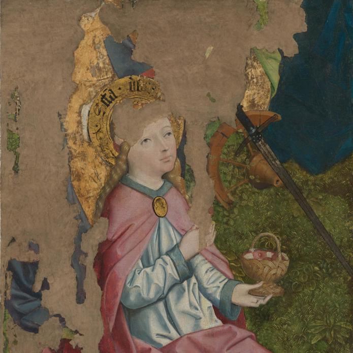 This is one of two fragments in the National Gallery’s collection of a larger work which showed the Virgin and Christ Child seated in a garden. It depicts Saint Dorothy, who lived in Caesarea (Kayseri in modern-day Turkey) in the fourth century.