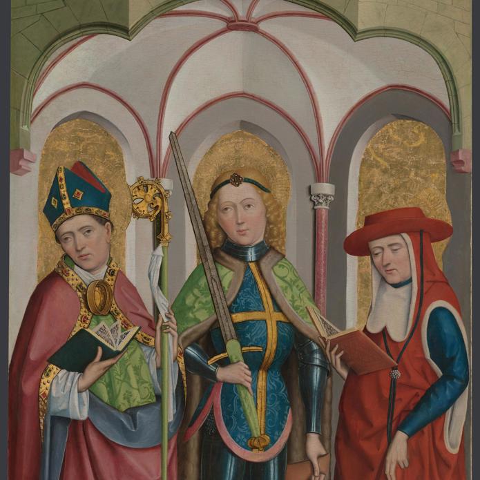 Saints Ambrose, Exuperius and Jerome are shown here beneath a vaulted Gothic ceiling, its structure is defined by red articulating ribs. It is probably intended to resemble a church interior. Saint Ambrose, Bishop of Milan, appears on the left in liturgical dress, including a mitre (hat) and a crosier which, as it resembles a shepherd’s crook, symbolises his role as shepherd of Christians. Saint Exuperius is shown in armour, a reference to his role in the Theban legion of the Roman army; its members all converted to Christianity in the fourth century. They were led by Saint Maurice, who appears in the centre of the opposite shutter. Saint Jerome stands with the lion that, according to legend, became his companion after he removed a thorn from its paw.
