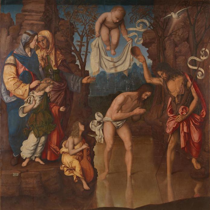 These two panel paintings formed the altarpiece for the Laderchi chapel in S. Andrea in Vineis, Faenza (the church was rebuilt in the eighteenth century and rededicated as S. Domenico). The main panel represents two episodes from the New Testament: the Visitation of the Virgin Mary to her cousin Saint Elizabeth, who was pregnant with Saint John the Baptist; and the baptism of Christ in the river Jordan by Saint John the Baptist. The lunette, or upper panel, shows the dead Christ sitting on his open tomb, supported by two angels.