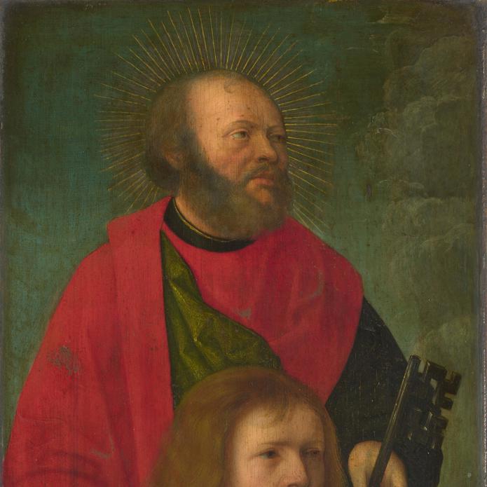 A man kneels in prayer, his patron saint, Peter – identifiable by the key he holds – standing behind him. This panel was once the left wing of a triptych (a painting in three parts); the right wing, which shows his wife, is also in the National Gallery’s collection. These figures and the missing central panel would have been visible when the altarpiece was open.