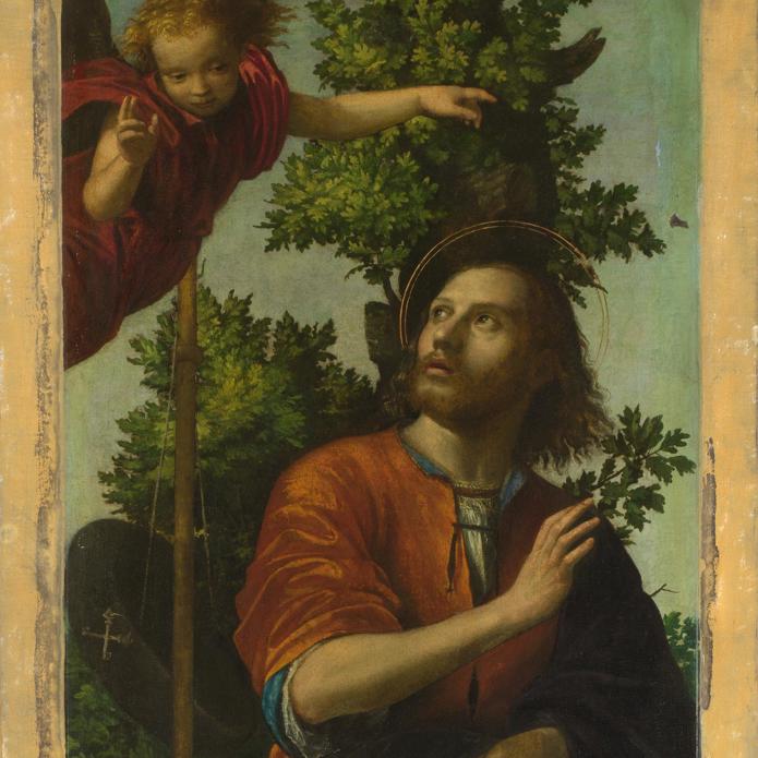 This painting of Saint Roch is one of the flanking panels of a three-panel altarpiece for S. Maria della Scala, Verona. The central panel of the Virgin and Child with Saint Anne by Gerolamo dai Libri is also in the National Gallery’s collection, but the other flanking panel, of Saint Sebastian by Francesco di Marco India Torbido, is missing. The commission for this work was connected with an outbreak of plague from 1510 to 1512.
