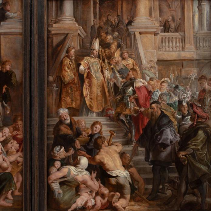 These three oil sketches, or modelli, were made by Rubens in preparation for an altarpiece for St Bavo’s Cathedral, Ghent, which was commissioned by Bishop Maes around 1611. The central panel shows Saint Bavo, a Roman solider who left the military to join the Christian Church, standing on the steps of St Peter’s Church, Ghent. Having given away all his money, he is being received by Saints Amand and Floribert as a monk. The left panel shows Saint Bavo’s sisters, Gertrude and Begga, who followed their brother’s example by becoming nuns. On the right panel, King Clothar and his son King Dagobert argue with a herald of the Roman Emperor Mauritius about a rule that forbade soldiers from becoming monks.