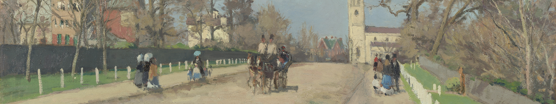 There is a calmness and tranquillity to the scene – if you can, imagine yourself stepping into the painting for a moment, let the gentle breeze envelop your being and the scent of the new buds on the trees permeate your nostrils. And with the expanse of the blue of the sky mimicking the hats and skirts of some of the figures grouped together or in pairs, imagine the conversation and chatter that they are engaged in as they promenade through this tree-lined avenue, with the sounds of the accompanying horses, trotting and snorting.
