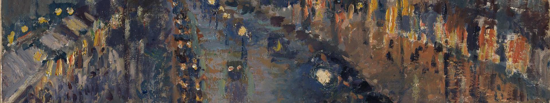 Pissarro painted this view from his hotel room between February and April of 1897. Of the 14 views he produced, this is the only night scene, and in fact, the only night scene he ever painted. Here, the plunging ‘V’ of the night sky captures the urban glow of the city, and the whole composition has a visionary quality.