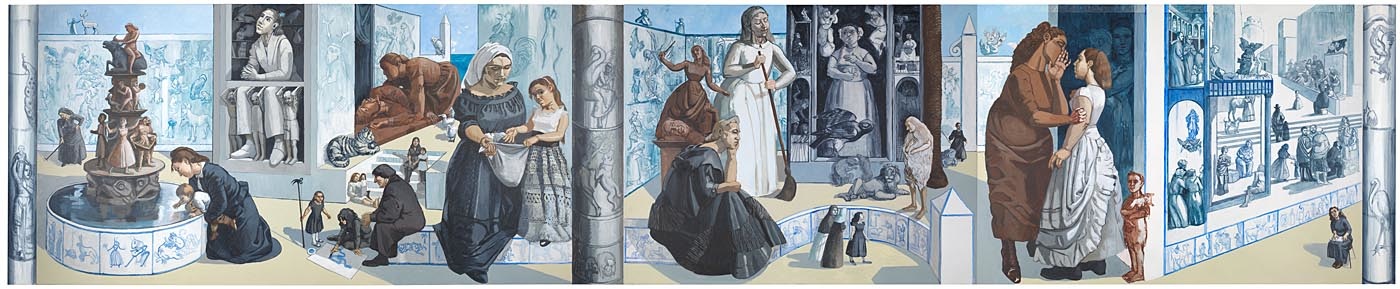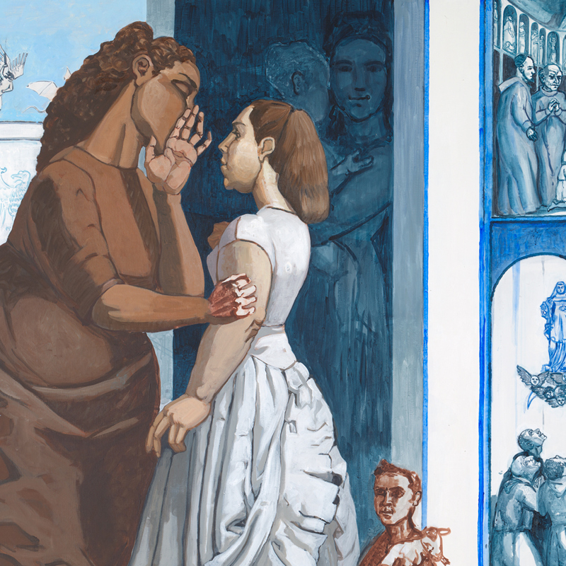 Rego reimagined Crivelli’s house and garden to explore the narratives of women in biblical history and folklore based on paintings across the collection and stories from the medieval Golden Legend. Her figures inspired by the Virgin Mary, Saint Catherine, Mary Magdalene and Delilah, share the stage with other women from biblical and mythological histories.