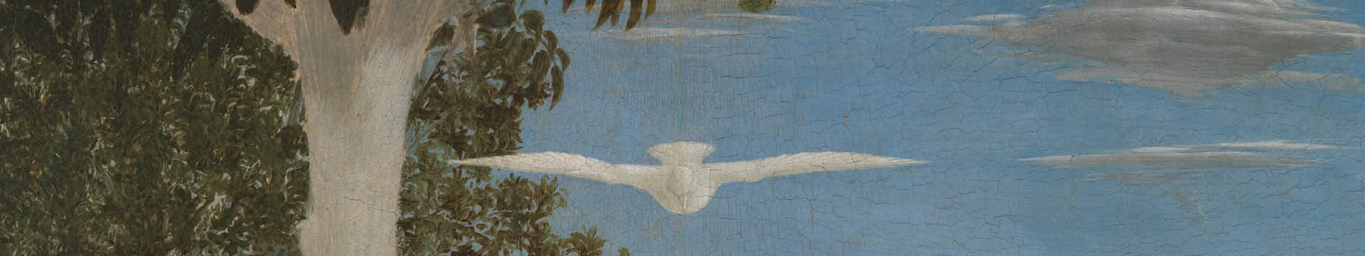 The scene is set in what appears to be a Tuscan valley; possibly representing the landscape around Piero’s home town of Sansepolcro. The cool water at Christ’s feet is at once the River Jordan and the streams of a Tuscan valley. We see the transition from transparent water in the shadow of the walnut tree to reflective water, in which we see a patchwork of hills.