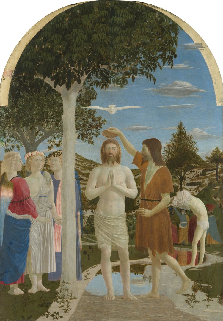 This painting from the Early Italian Renaissance depicts Christ's baptism in the River Jordan. Christ's cousin, John the Baptist, gently pours water from a bowl onto Christ's head and the Holy Spirit, in the form of a dove, appears hovering overhead.