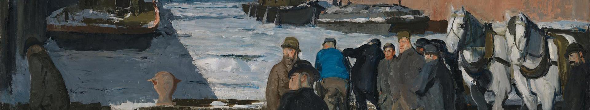 It’s been a long, cold wait for these day labourers, anxious to hear if they will be offered work today, loading and unloading cargo from the docked ocean liner. The work is low-paid and uncertain. In 1912, when this painting was made, longshoremen earned around $10–22 a week, while a budget apartment in New York cost around $10 a week.