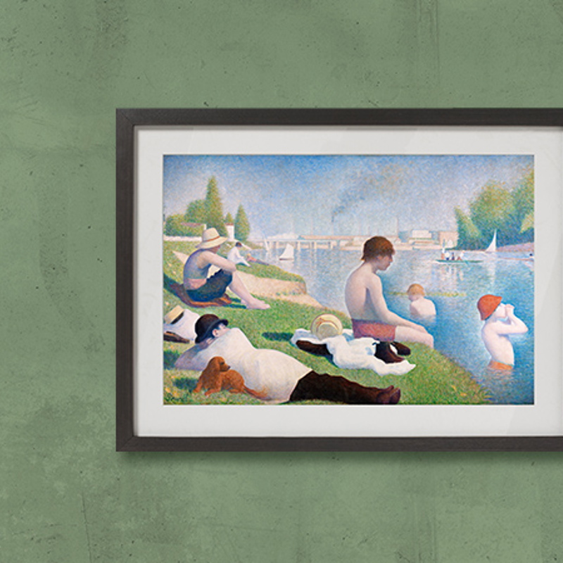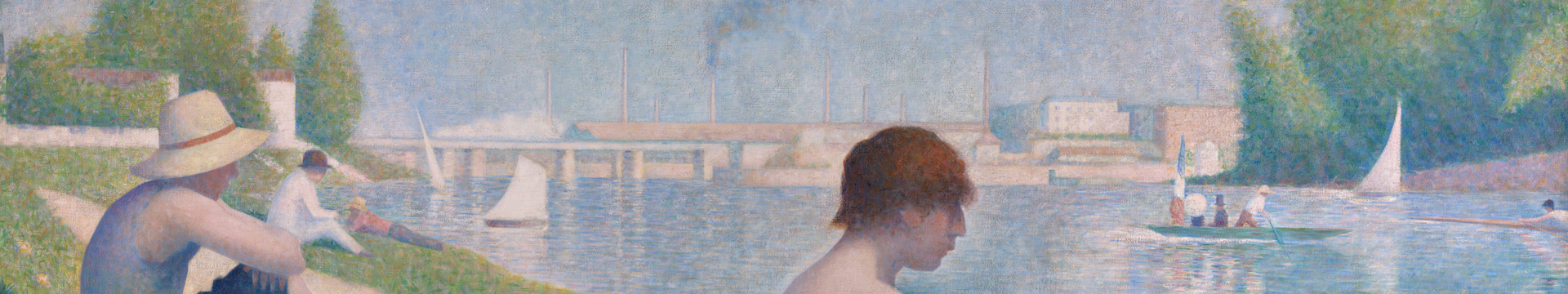 Bathers in Western art were traditionally associated with mythological gods and goddesses. I believe Seurat adopts this theme, and the monumental painting format, which was also associated with heroic figures, to aggrandise working class and lower middle-class figures. We literally look up to these men; rendered large, important, and visually occupying attention. There is a sense of calmness and serenity, partly due to the classical order of its frieze-like composition, which endows the figures with a sense of dignity and poise. Seurat places ordinary working men in a central position within art – a place traditionally denied to them.