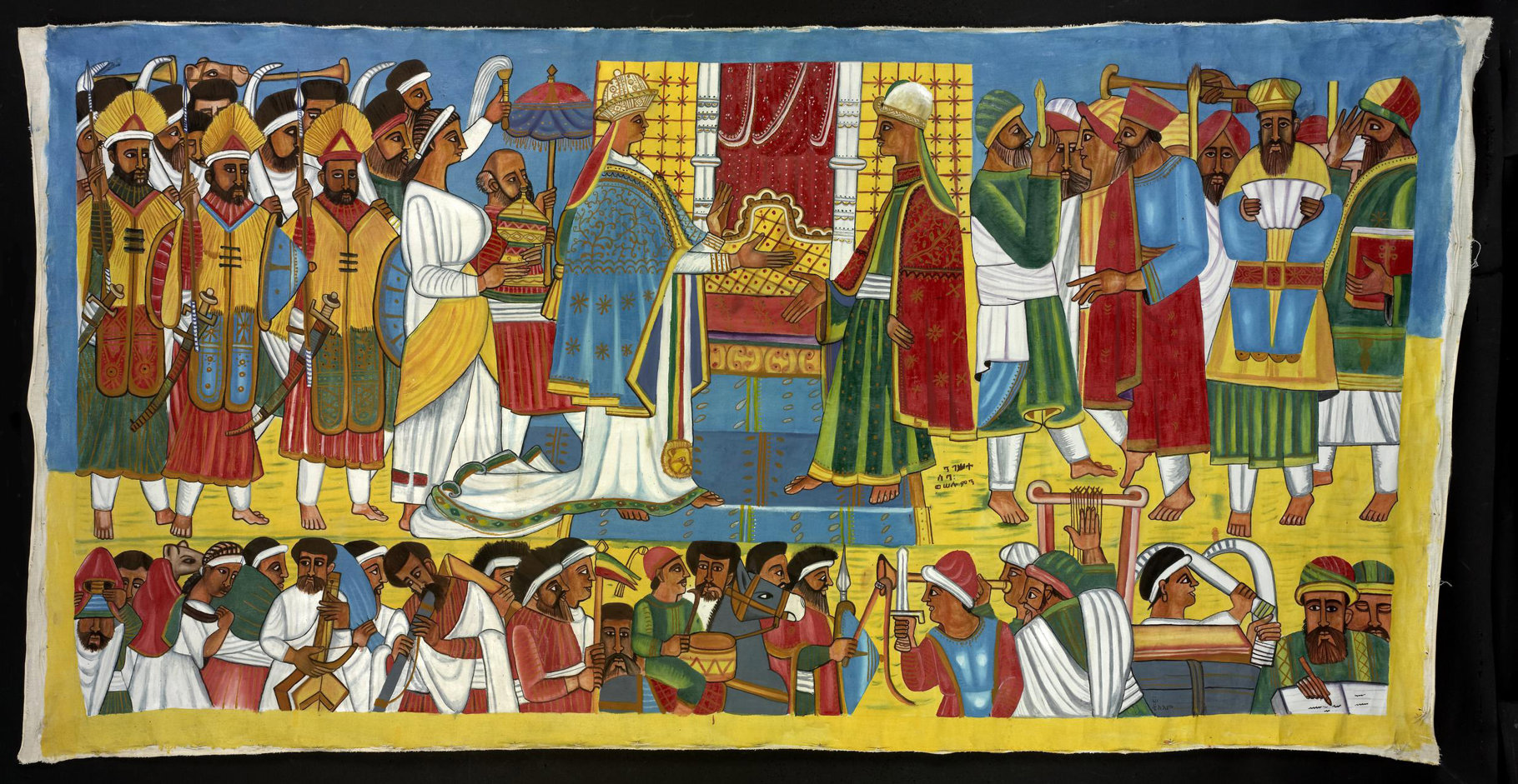 In his work, priest-turned-artist Qes Adamu Tesfaw draws on the Gondarine style of religious Ethiopian painting, characterised by bright colours and flat, relief-like composition. He paints the Queen of Sheba wearing a blue cloak and green, yellow and red sash – the colours of the Ethiopian flag. The King and Queen are followed by a similar number of attendants, and unlike other representations where Solomon is seated higher, the pair meet on a level plain, poised to shake hands. This emphasises the diplomatic weight her visit carries; the Kebra Nagast traces the descent of all Ethiopian kings from the illustrious meeting of Makeda of Saba (Sheba) and Solomon.