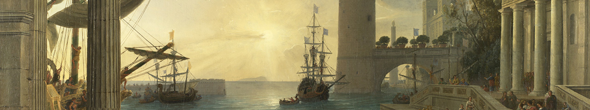 In 'Seaport with the Embarkation of the Queen of Sheba', we are presented with a bustling seaport, alive with activity, and suffused with the warm light of the sunrise. Claude typically depicted biblical or mythical journeys, but here, he has chosen to depict an embarkation, ships beginning a journey. The Queen of Sheba – miniscule in size, identifiable by her crown and royal blue cloak – descends the steps on the right-hand side of the painting, accompanied by two attendants.