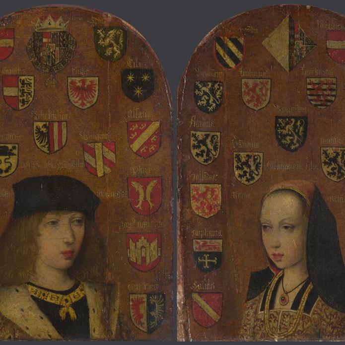 This teenage brother and sister were the heirs of royalty and future rulers themselves. Philip the Handsome and Margaret of Austria were the children of the Holy Roman Emperor, Maximilian I, and Mary of Burgundy. Each is identified by an inscription in gold above their head and by the coats of arms at the top of the arch. Around them are further coats of arms representing the states and towns their parents governed.