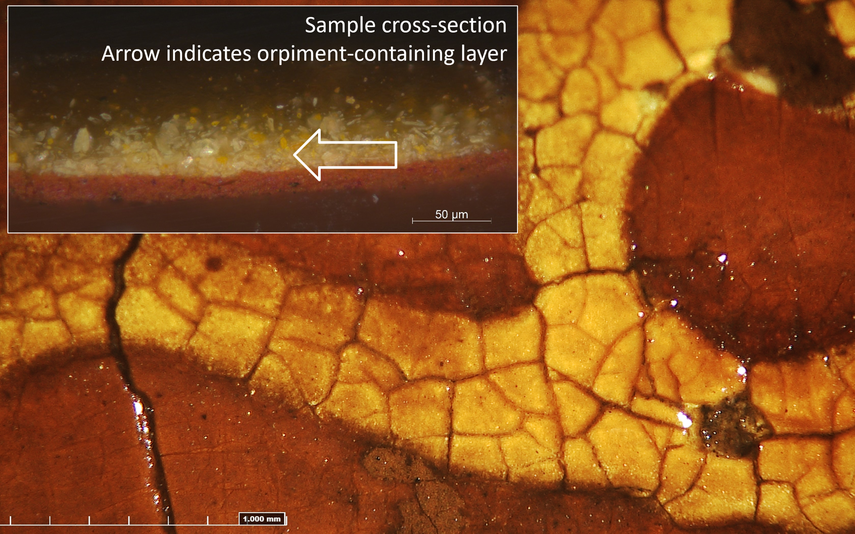 Another early use of orange comes from a mineral called orpiment, which has a natural golden yellow tone. It is another pigment which is toxic, with a high arsenic content.