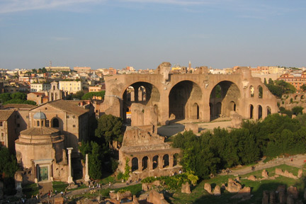 Although we might expect some attempt to render the historic moment or period of Christ’s birth in these pictures, in practice artists were rarely concerned with archaeological reconstruction, instead taking inspiration from previous artists’ versions and from accounts of the Nativity in texts such as The Golden Legend, and the visions of Saint Bridget of Sweden.3 The passage in ‘The Golden Legend’ which describes how the Temple of Peace in Rome (the building known as the Basilica of Constantine or the Basilica of Maxentius, fig. 2) crumbled on the night of Christ’s birth, was adopted by European artists to convey the rupture and momentous historic change brought about by Christ’s birth – year zero as it was later to be established by Christians.4