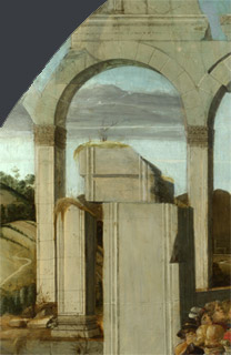 Botticelli’s architecture in the ‘Adoration’ tondo raises many questions, retaining the mystery of the ruin. The first difficulty is to imagine what type of building this might be and its ground plan. We seem to be looking into a longitudinal nave, its portal strongly suggested by huge blocks of stone guarding the entrance to the image, its roof once supported by a series of arches resting on a giant order of rectangular piers. Extending at right angles to this nave, to the left, a further series of arches of the same classical order and height continue beyond the picture’s edge. A giant transept might be implied, especially when a close inspection reveals that Botticelli originally extended this arcade across the right-hand side of the picture (fig. 13);20 but it is not clear how this ‘transept’ connects with the ‘nave’.
