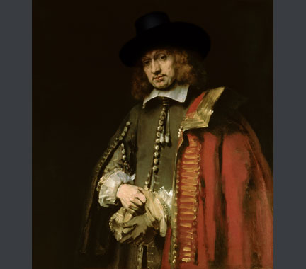 The noted ‘Venetian’ effect results largely from the use of comparatively pure pigments: the bright red on the man’s left cuff is pure vermilion, the orange-yellow streaks in his robe are just natural earth pigment, and the deep purplish glazes consist solely of red lake pigments. This use of red lake glazes on the sitter’s gown and on his hand would be most unusual in authentic paintings by Rembrandt of this period.