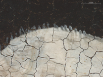 By chance, a hair shed from a paint brush used for Van Eyck's portrait of his wife remains embedded in the black paint at the left edge. Its length (about 6 mm) and colour indicate that it is probably from a fine brush made from the tail fur of a squirrel or a member of the weasel family, much like a modern sable brush.