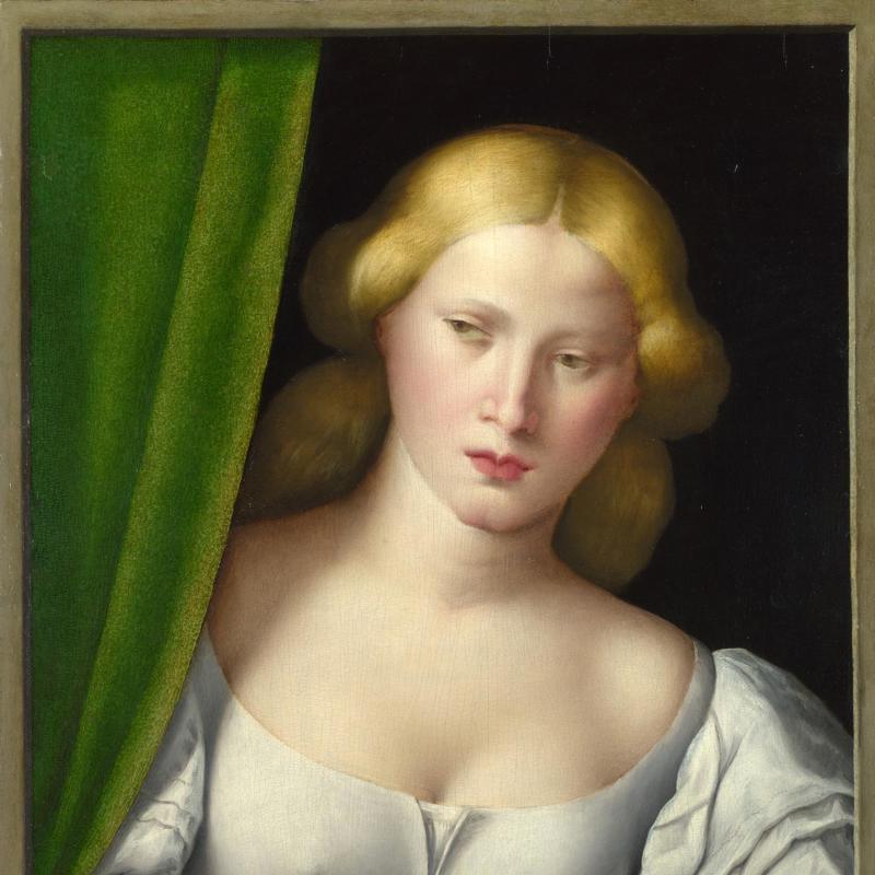 A more likely explanation, however, is that the painting was adjusted to conform to 19th-century mores with the intention of making it saleable prior to the acquisition by the Gallery. In its original state, the figure’s pronounced bust, sidelong glance and appearance at a window (not a common motif in North Italian portraits of women) suggest that she might be a courtesan or a prostitute. It is also conceivable the alterations were effected to make it more like the work of Palma Vecchio, for as the layers of overpaint were stripped off, so too were the old attributions to Palma Vecchio (and, for that matter, Pordenone).
