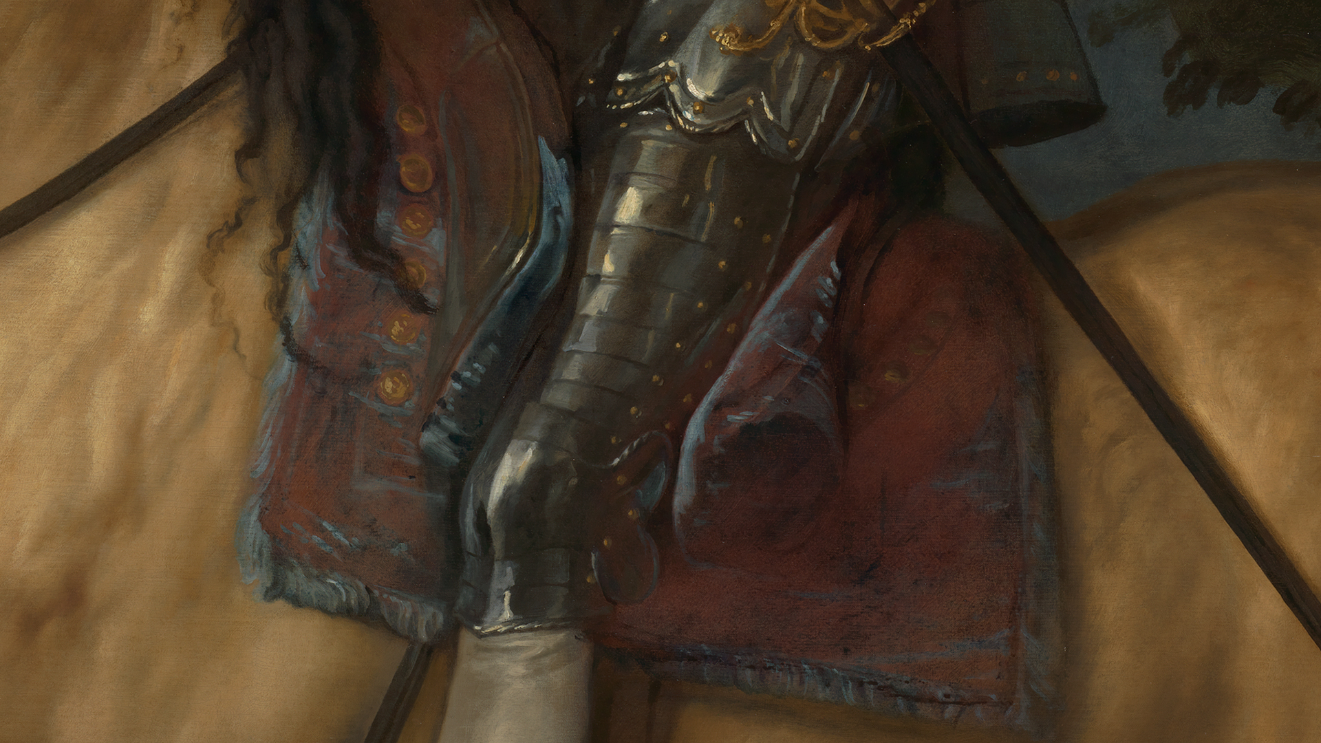 The king's equerry, bottom right, blends almost too well into the background. He's passing a plumed helmet up to the king. Van Dyck uses the same scrolling brushstrokes for both the plumes and the equerry's wavy hair.