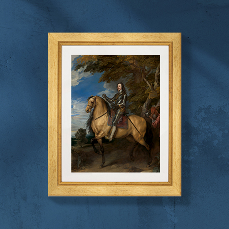 With his signature goatee, moustache and pearl earring, King Charles I sits effortlessly on his horse.
