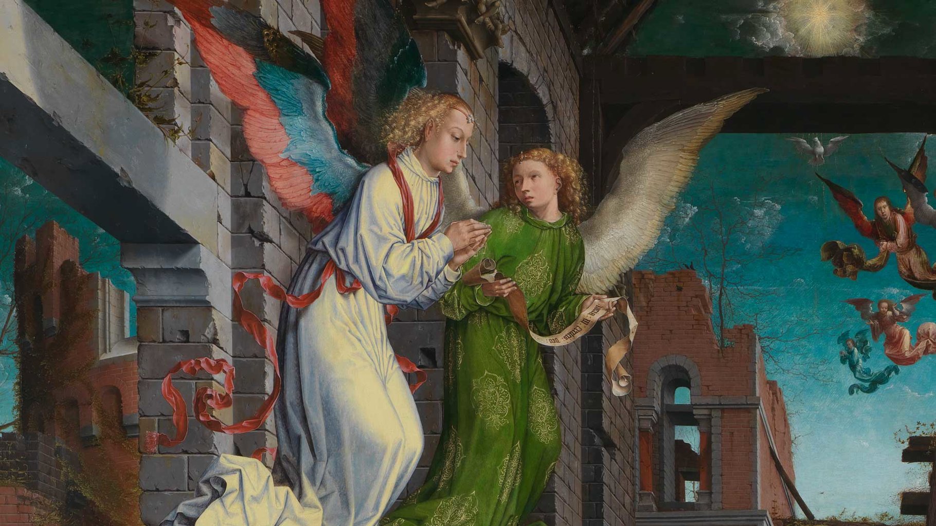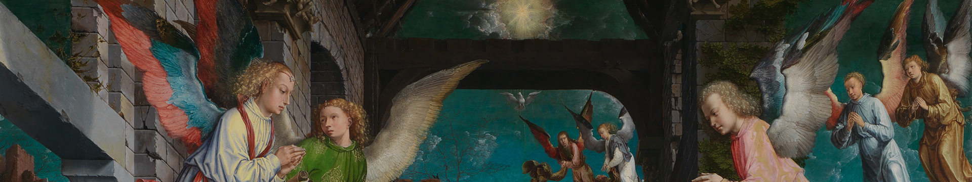 Our eyes move around the painting, taking in the broken tiles on the ground and the angelic figures in the sky. Gossaert brings together the earthly and the celestial as heaven and earth collide at this moment of immense change – the birth of Christ.