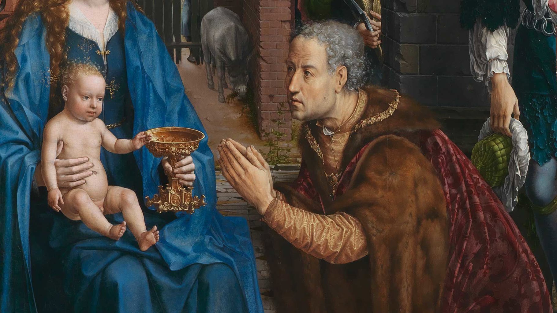 This is a particularly striking feature of the painting: all the kings have very human faces. Despite their fabulous jewels, rich fabrics and luxurious furs, Gossaert includes their grey hair, hairy warts and bunions.