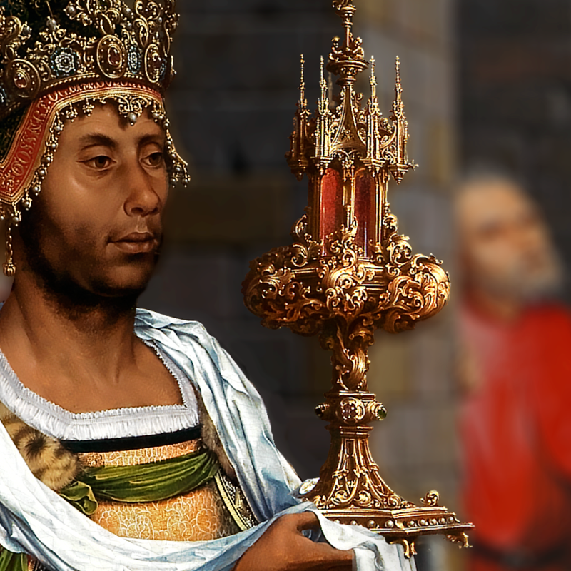 Balthasar's elaborate headdress shimmers with gold and pearls.