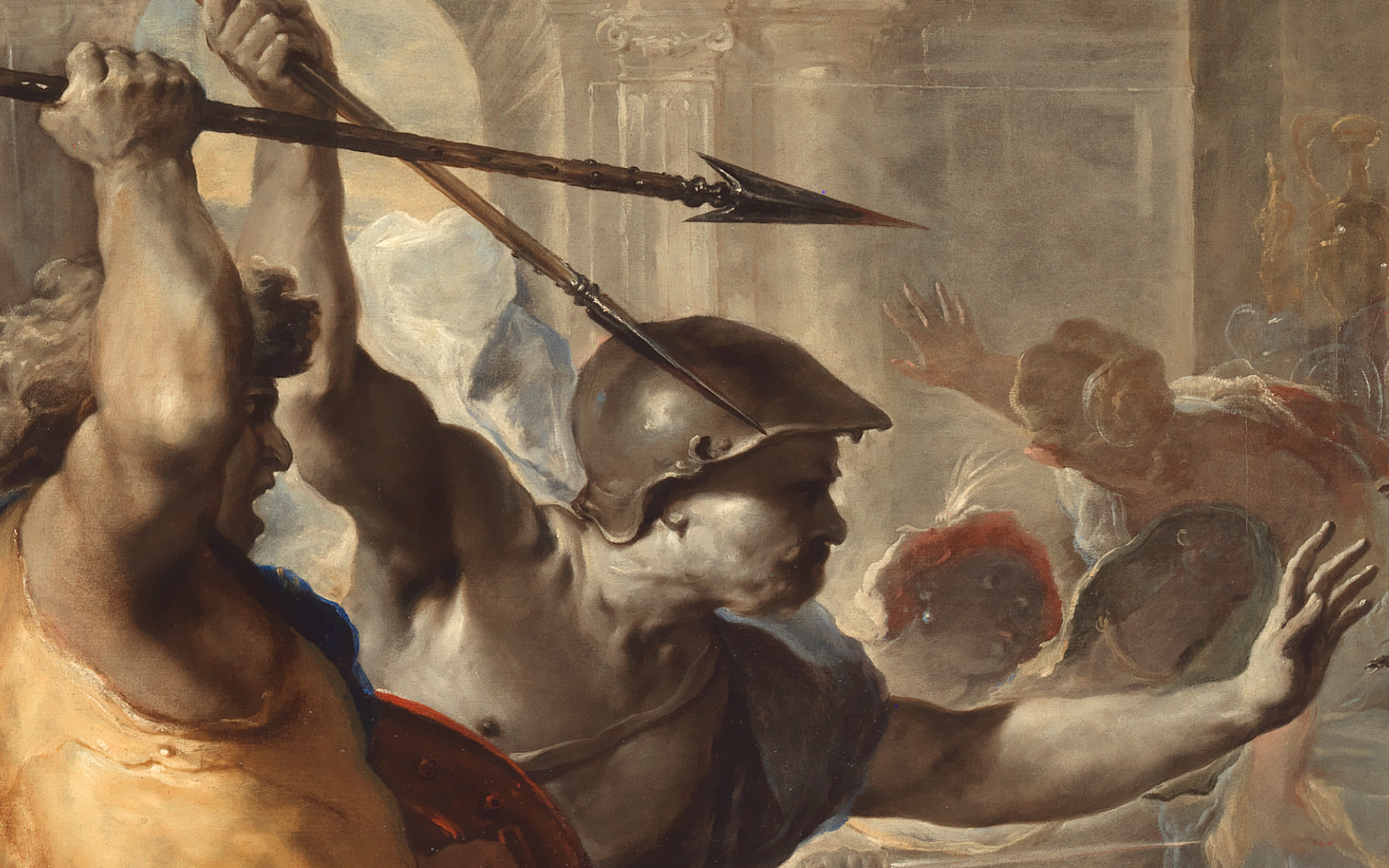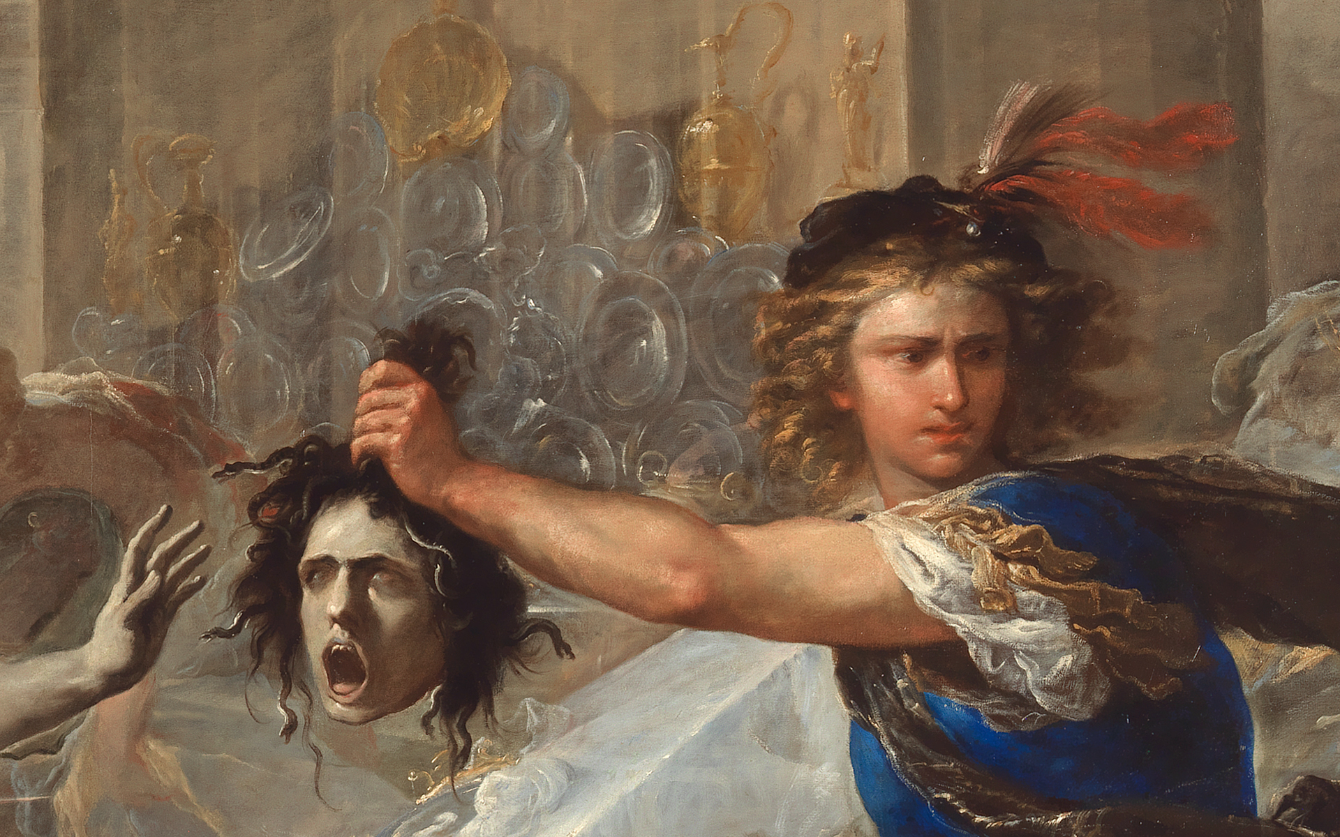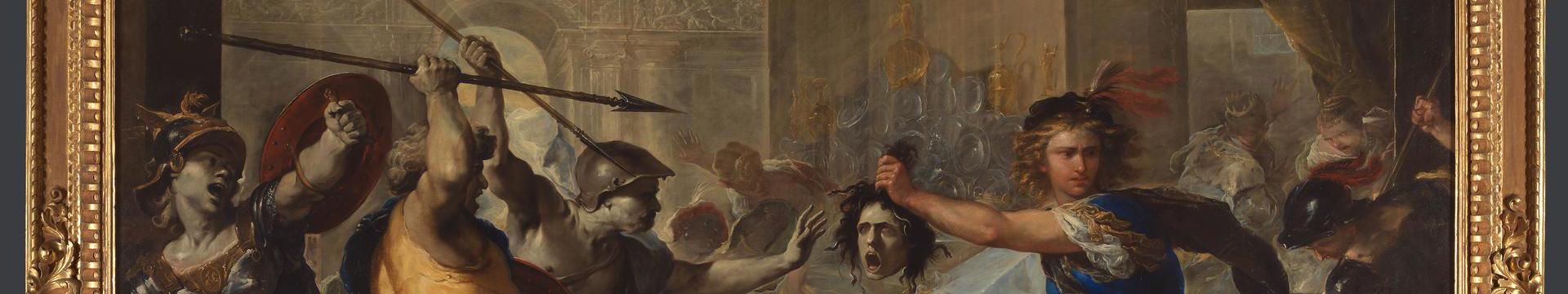 Perseus, with his hair flowing and feathers fluttering, thrusts the gorgon Medusa's head towards his attackers.