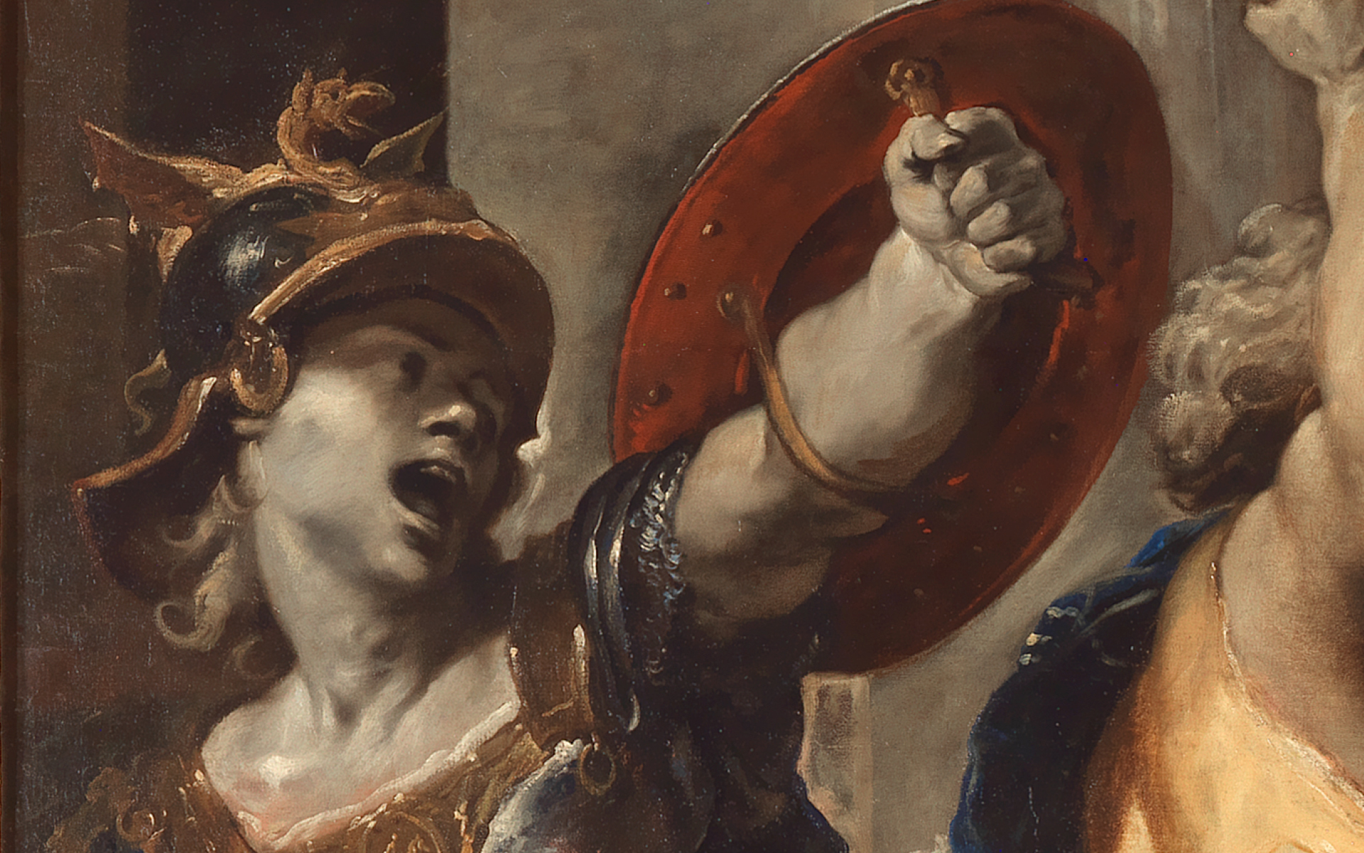 The red feathers, his flushed face and pink skin tone contrast with the gorgon's decaying head and the grey stone arm held out by an opponent in a vain attempt to deflect the death stare.