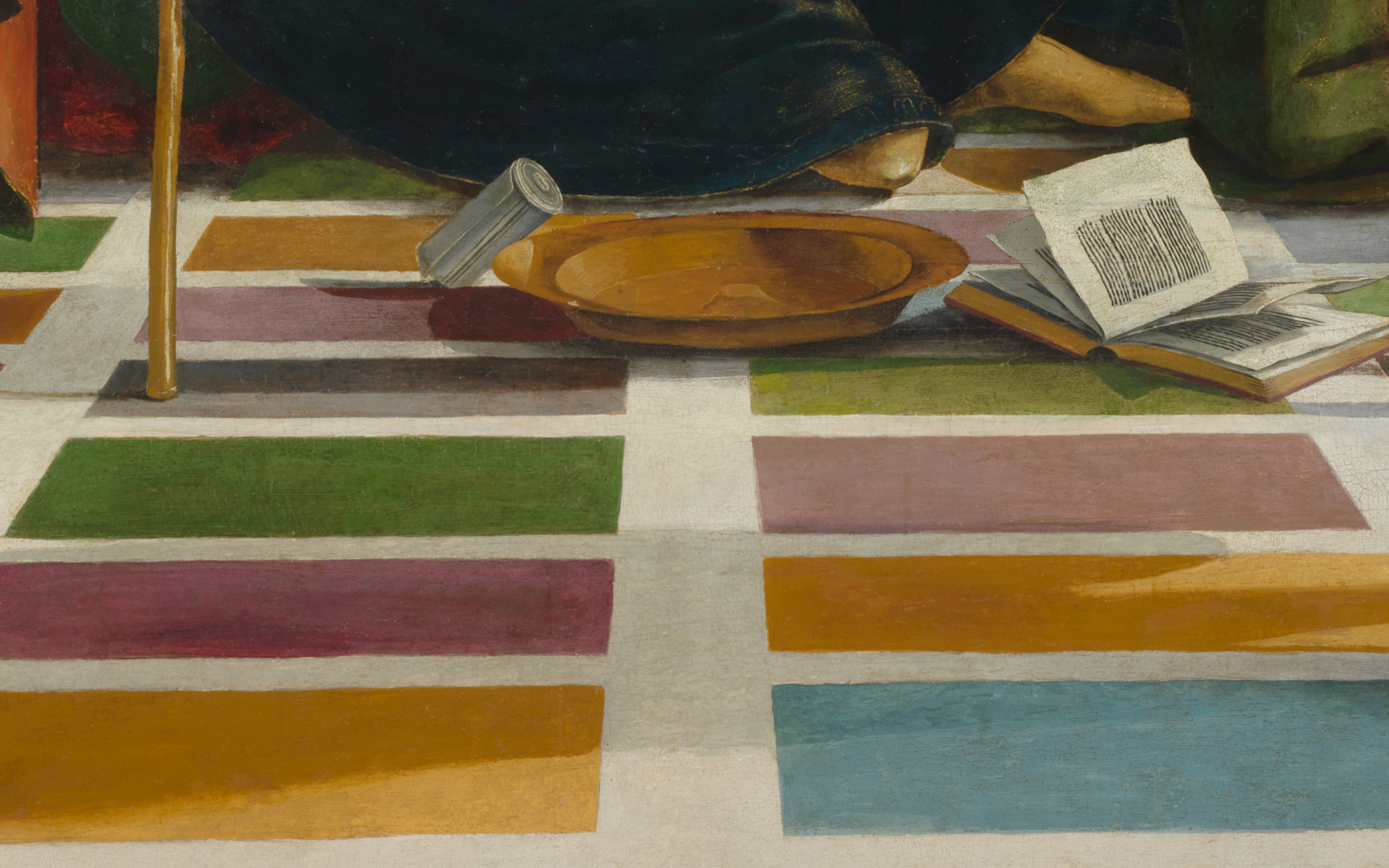 Signorelli's wonderful tiled floor, with its simple geometric design and bright colours, leads us towards the main action.