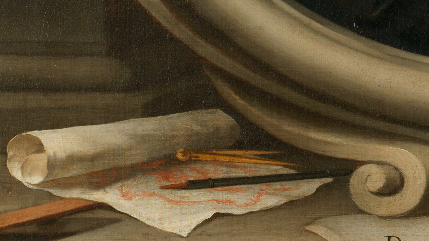 The shiny oil paints add texture. The angle of the brushes, mirroring the angle of the chalk and straight edge on the other side, recede behind the frame to provide the illusion of depth.