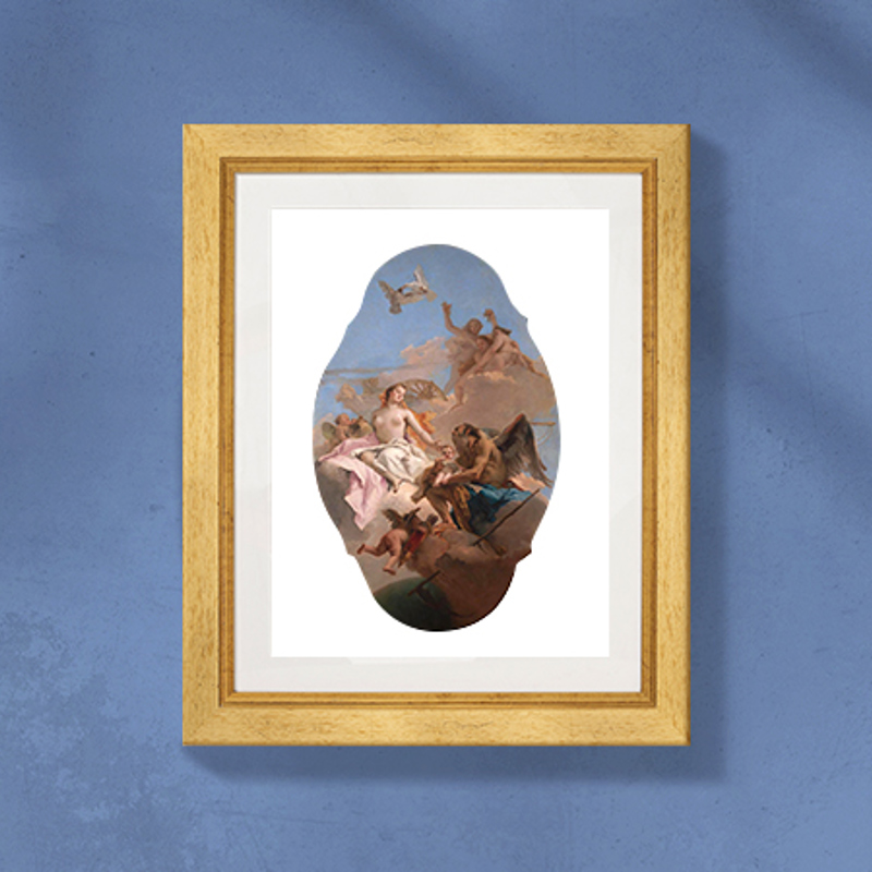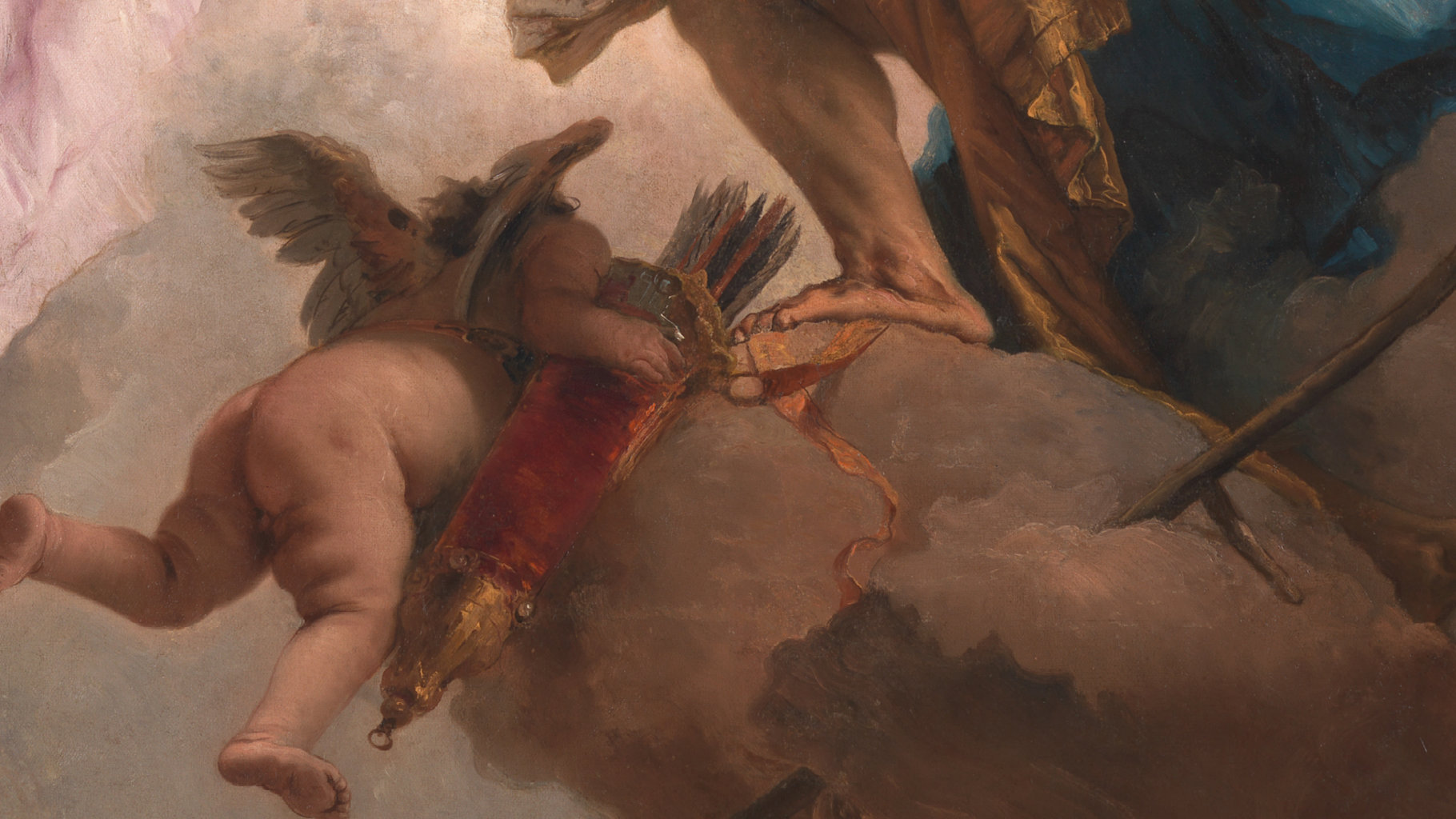 The painting's sky would have come alive in the work's original position on the ceiling. The foreshortening of Cupid's toddler legs adding to the illusion that we are looking up at airborne gods and goddesses.