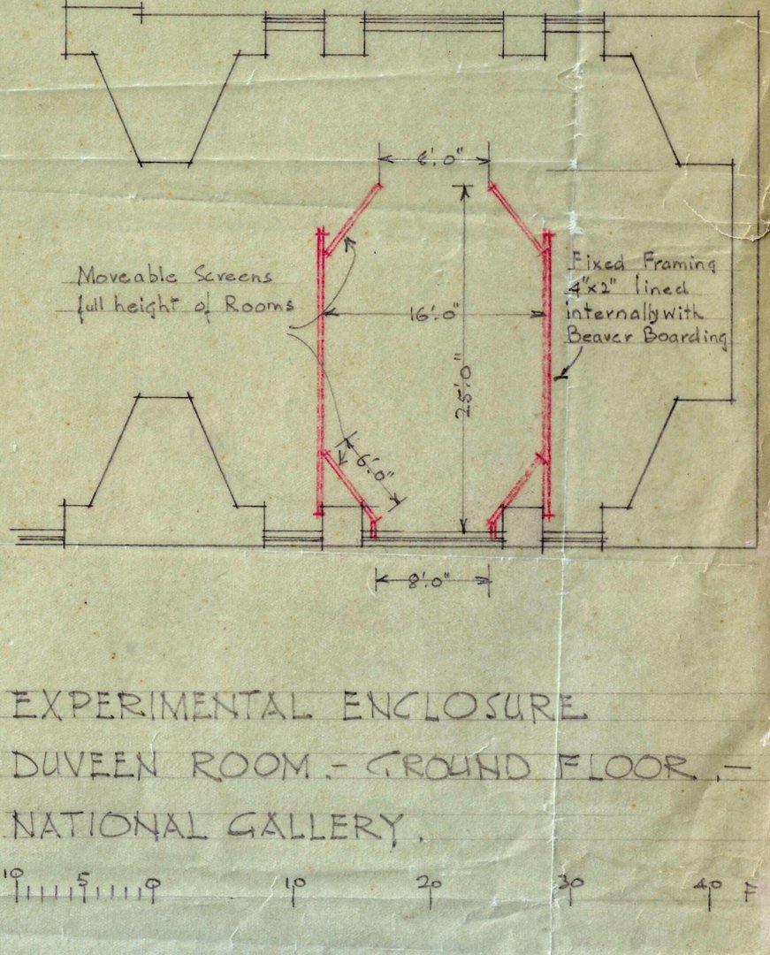 Sir Martin Davies, Director at the time, believed that 'the ideal of hanging – for the National Gallery – is that all the pictures look their best, and nobody notices anything but them'. This meant obscuring any architectural features and adjusting rooms to suit different types of paintings. The Gallery started to experiment more with the display of the pictures in the existing main floor rooms.
