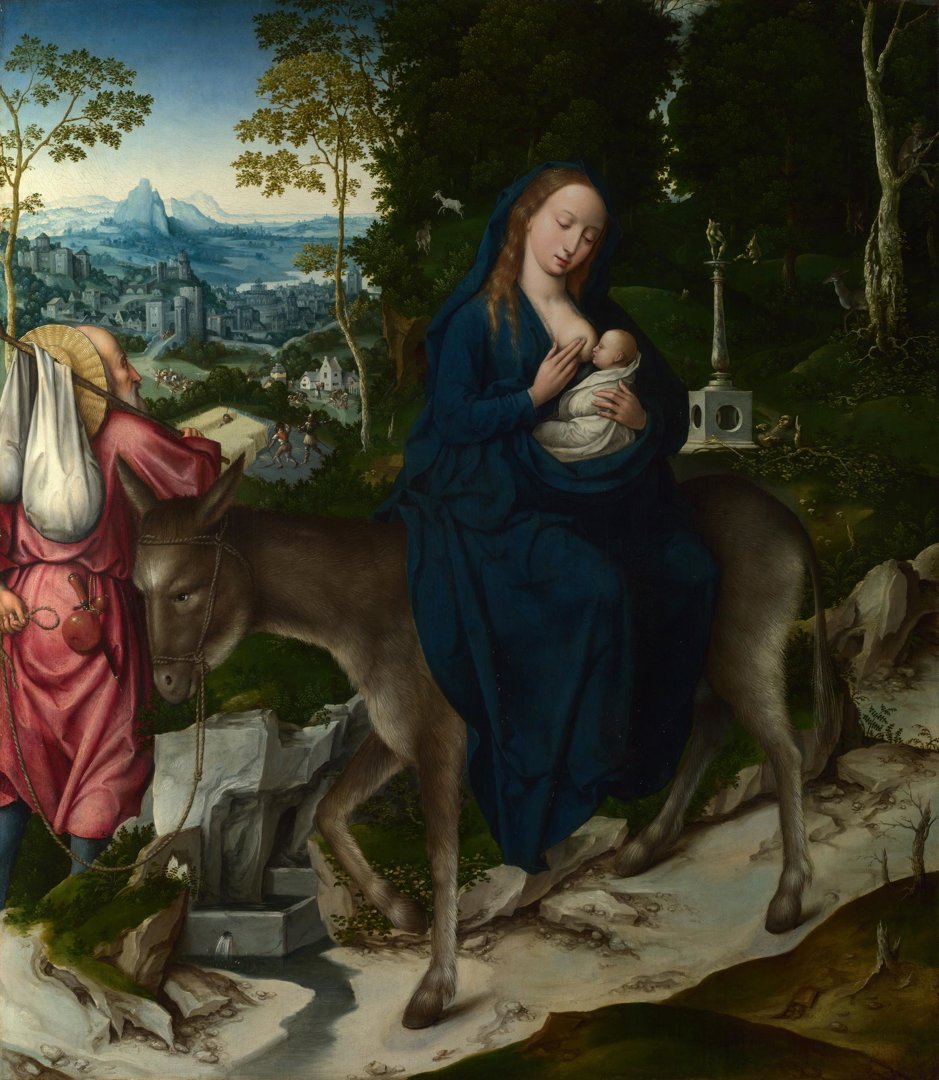 In this painting of the Flight into Egypt, Joseph is shown following the angel’s advice. In the background we see the head and torso of an old pagan statue falling to the ground, referring to the legend that statues of pagan idols crumbled as the holy family, representing a new religious era, passed.