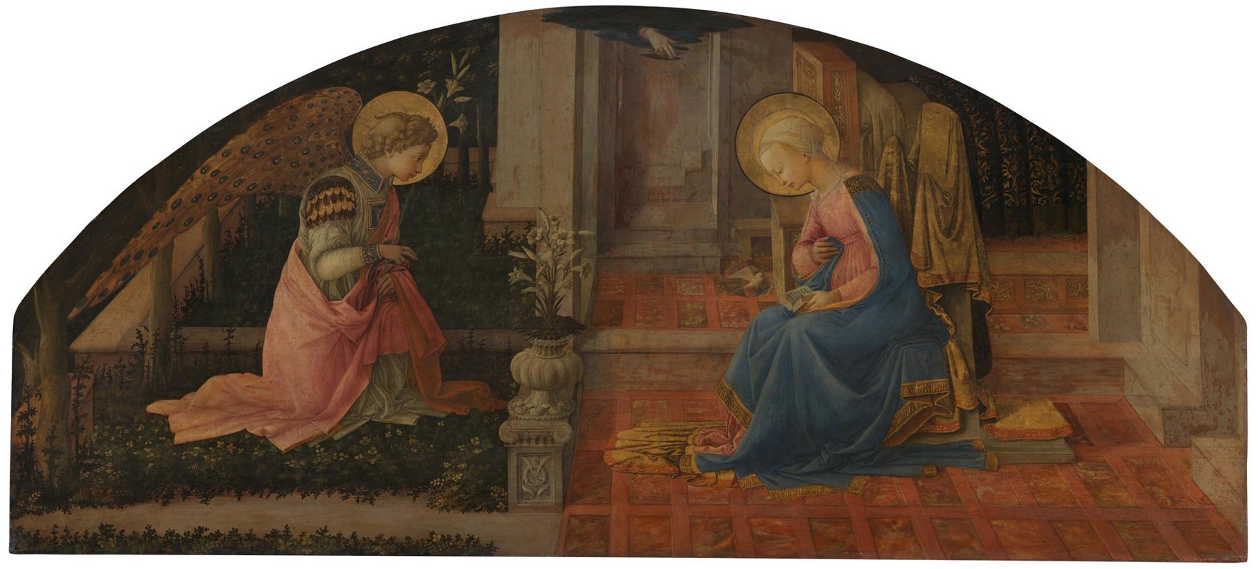 In Fra Filippo Lippi's beautifully symmetrical depiction of the Annunciation, the angel Gabriel is shown on the left with peacock feather wings. It was traditionally thought that at the moment of Gabriel’s arrival, Mary was reading the prophecy in the Old Testament book of Isaiah that a virgin would give birth to a son.