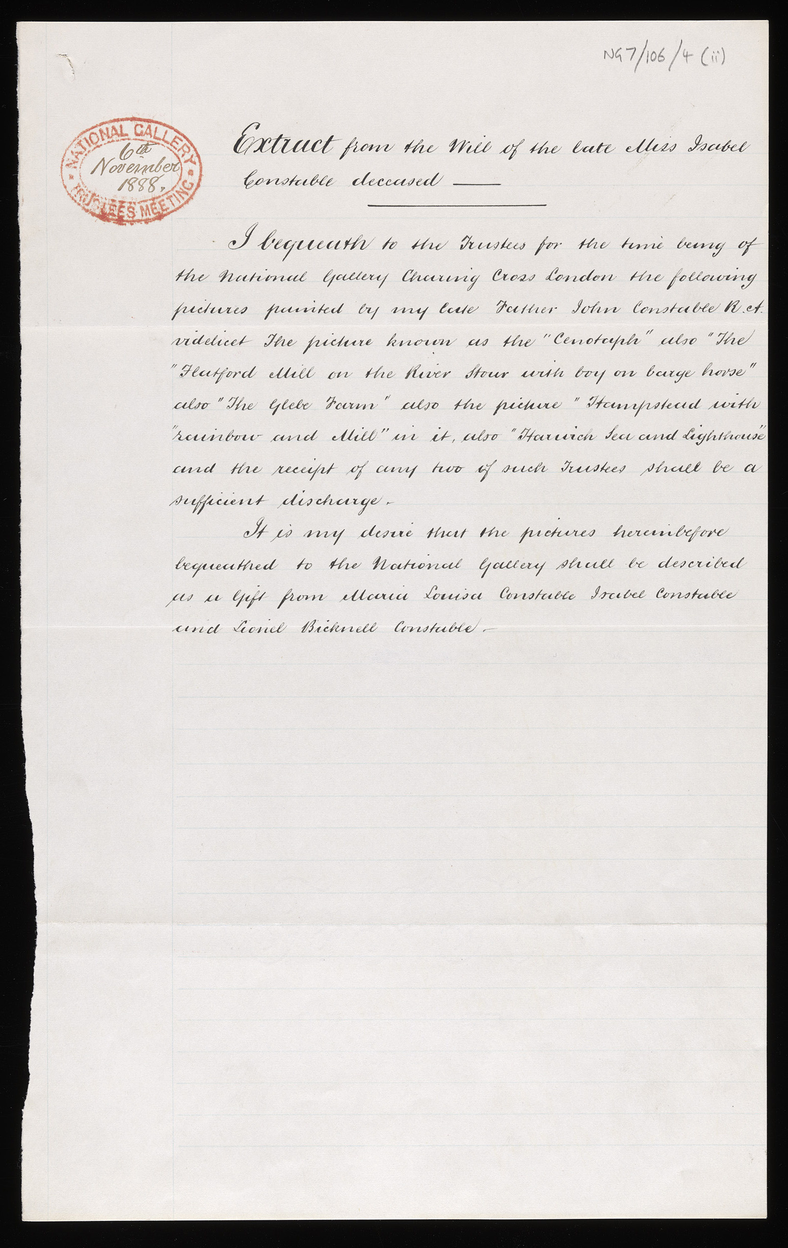 At the close of 1888, the Gallery received word that Miss Isabel Constable, the eldest and last surviving child of John Constable, had left five of her father’s oil paintings to the Gallery upon her death. It was her wish, as outlined in her will, that the paintings recognise all three of Constable’s children and be acknowledged as 'a gift from Maria Louisa Constable, Isabel Constable and Lionel Bicknell Constable'. Included in her bequest was ‘Cenotaph to the Memory of Sir Joshua Reynolds' - the four other paintings included in the bequest were later transferred to the Tate.