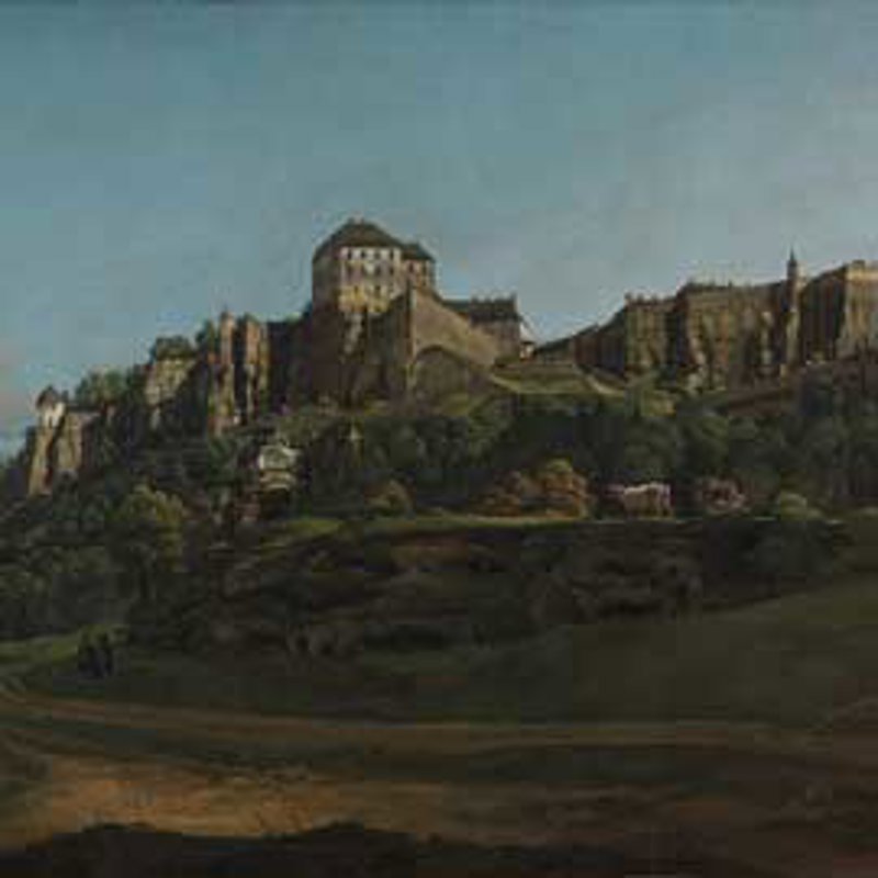 The vast (132.1 x 236.2 cm) panoramic painting which depicts the Fortress of Königstein, near Dresden and is one of a series of five large-scale views of the ancient hilltop fortress commissioned by Augustus III, King of Poland and Elector of Saxony, in about 1756. Here, the fortress is seen perched atop a crag, its fortifications providing an imposing contrast to the verdant landscape that surrounds it, in which peasants talk and work. Bellotto combines topographical accuracy in the fortress with pastoral invention in the figures. Imbued with a monumentality rarely seen in 18th-century Italian view painting, 'The Fortress of Königstein from the North' dramatically illustrates the very different direction in which Bellotto took the Venetian tradition of the 'veduta'.