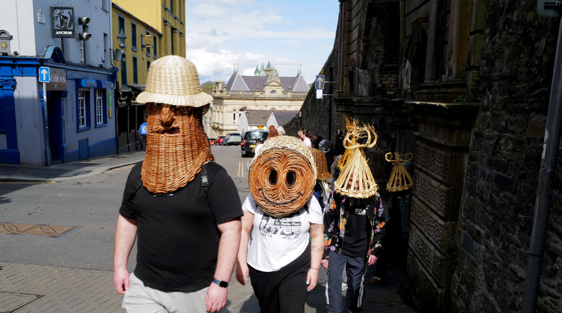 The Armagh Rhymers playing traditional instruments were accompanied by The Playhouse Young Artists Programme, wearing bespoke wicker heads by Bob Johnston that took inspiration from archetypes of the early 90s dance floors and rave culture. This merry band of mischief-makers travelled through the shopping centre and streets into Guildhall Square.