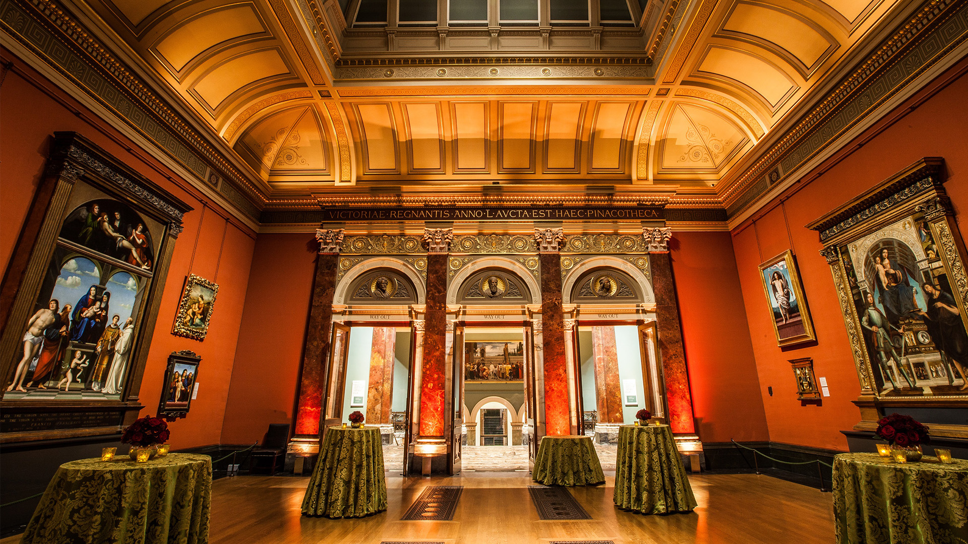 Direct views over Trafalgar Square, our newly remodelled mezzanine hospitality space as part of our Sainsbury Wing redevelopment. The perfect place for drinks receptions and pre-dinner drinks before dining amongst our masterpieces.