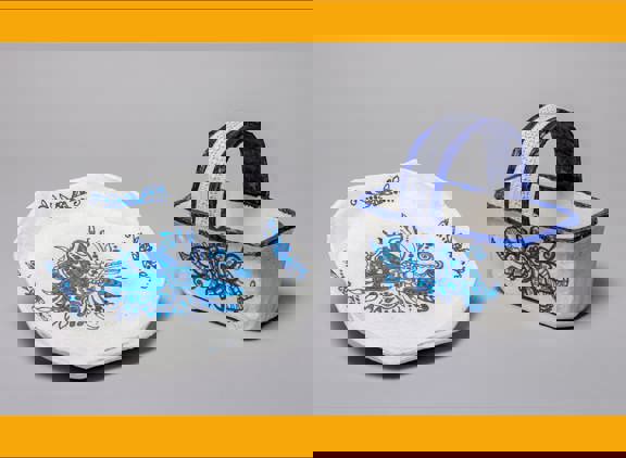 After wondering if the maid is carrying a bowl, we decided to make our own plates, bowls and dishes. We used the famous blue and white colour palette from Delftware pottery, and patterns from painted henna Mendhi designs to create our own fusion pieces.