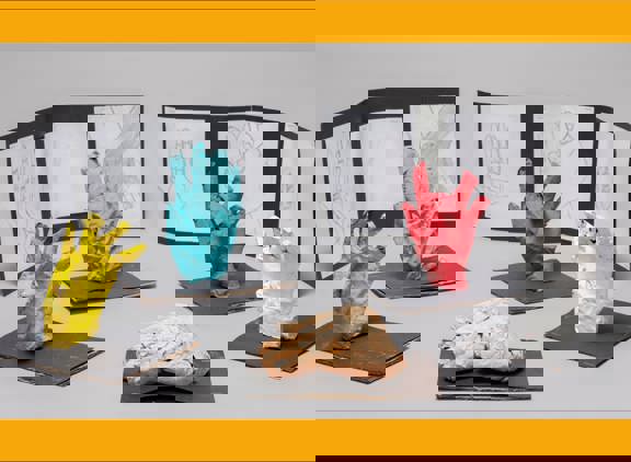 We focused on the hands in the painting and noticed that they are all doing different things. We took photographs of our own hands holding different objects, and made detailed sketches and models using card, paper and glue.